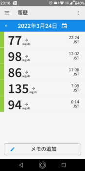 | 2022-03-24 | 血糖値 | 食事 | 即効性インスリン 注射量 | 持続性インスリン 注射量 |