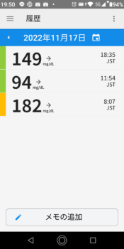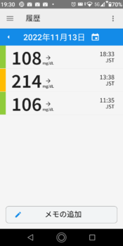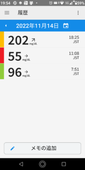 | 2022-11-14 | 血糖値 | 食事 | 超即効性インスリン 注射量 | 持続性インスリン 注射量 |