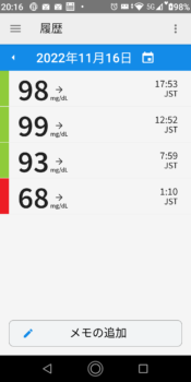 | 2022-11-16 | 血糖値 | 食事 | 超即効性インスリン 注射量 | 持続性インスリン 注射量 |