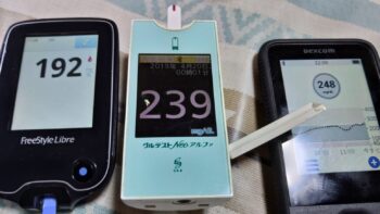 左が、リブレでの血糖値で、真中がグルテストNeoアルファでの血糖値で、右がDexcom G6でのグルコース値です。