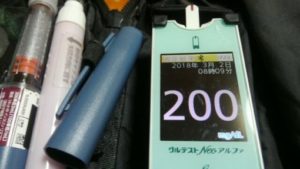 ・朝食前血糖値は少し高く、200mg/dlでした。