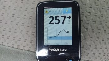 ・昼食前血糖値は高く、257mg/dlでした(昼前に、ポカリスエット350mlを1本飲んで高血糖になりました)。