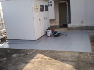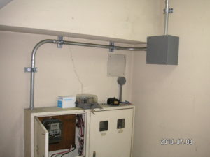 キュービクルの6600Vの電源を落しますから、一棟ごと停電です。テナント様が帰られてからの施工となります。