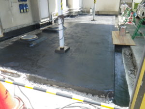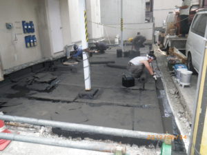 施工は防水性の高いアスファルト防水(塗る+貼る工法)です。ほとんどのビル、マンションの屋上も新築時はこの工法でした。