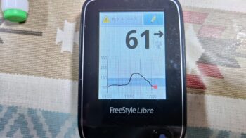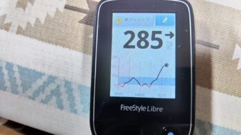 ・夕食前血糖値は高く、285mg/dlでした(午後3時頃に低血糖な鳴ったので、缶コーヒーとお菓子を食べたら、高血糖になりました)。
