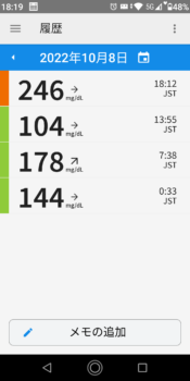 | 2022-10-08 | 血糖値 | 食事 | 超即効性インスリン 注射量 | 持続性インスリン 注射量 |