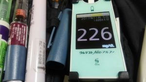 ・夕食前血糖値は高く、226mg/dlでした。昼食は600キロカロリーでと思いますが、3時頃におやつを少量食べただけで、血糖値は上がりました。