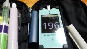 ・夕食前血糖値は高く、196mg/dlでした。昼食は600キロカロリーでと思いましたが、インスリン注射量を1単位増やすべきでした。