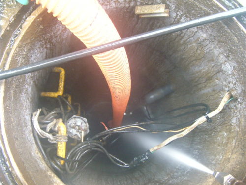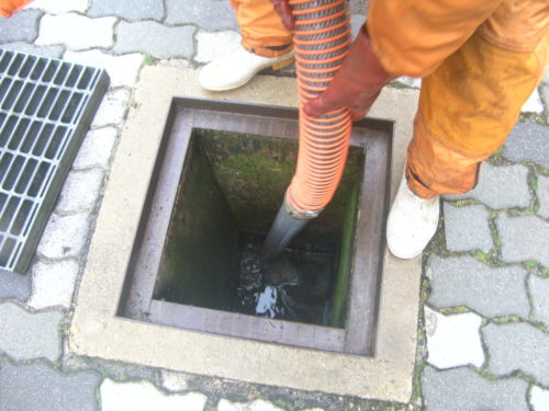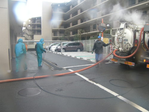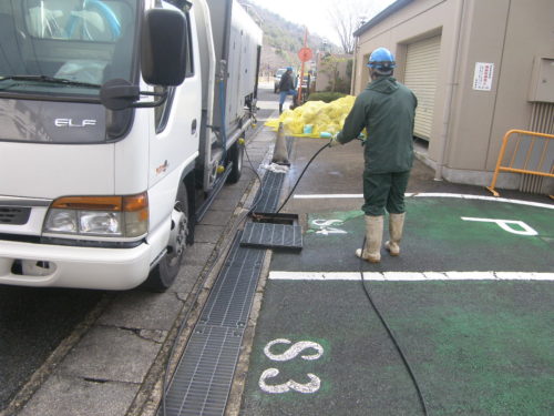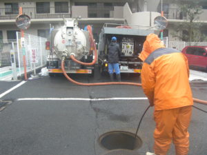 溜まっているものは土砂類ですから産業廃棄物です。超真空ダンパー車と高圧洗浄車を使用します。