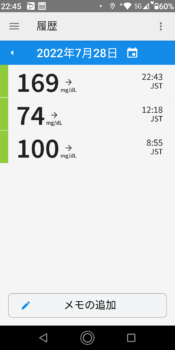 | 2022-07-28 | 血糖値 | 食事 | 超即効性インスリン 注射量 | 持続性インスリン 注射量 |