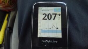 ・昼食前血糖値は高く、207mg/dlでした。(低血糖予防のため、10時ごろに缶コーヒーを1本飲みました。)