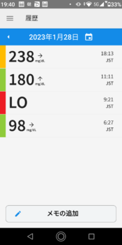 | 2023-01-28 | 血糖値 | 食事 | 超即効性インスリン 注射量 | 持続性インスリン 注射量 |