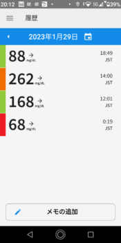 | 2023-01-29 | 血糖値 | 食事 | 超即効性インスリン 注射量 | 持続性インスリン 注射量 |