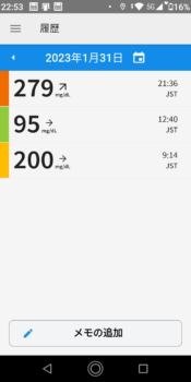 | 2023-01-31 | 血糖値 | 食事 | 超即効性インスリン 注射量 | 持続性インスリン 注射量 |