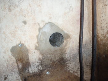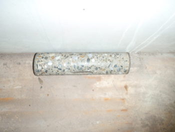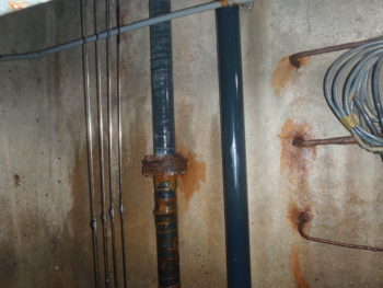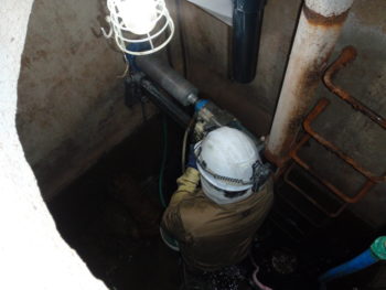 雑排水槽と汚水槽間の壁にコア(連通管)を開ける作業です。100mmの穴を42cm分開けましたが人工ダイヤの威力は凄いものがあります。