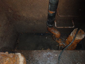雑排水槽は、排水の揚水管が破れていたため、使用できないので、新しい水中ポンプを設置して、排水を隣の汚水槽内へ放流する設計にしました。
