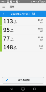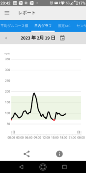 | 2023-02-19 | 血糖値 | 食事 | 超即効性インスリン 注射量 | 持続性インスリン 注射量 |