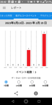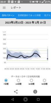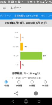 二つ目の画像は、自分で目標血糖値を定めているのですが、87%でクリアできているということです。141~240mg/dlまでが10%で、241mg/dl以上が1%、低血糖のー70mg/dl以下が2%ということです。