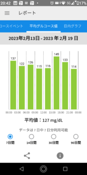 下記のリブレのグルコース値の通り、この一週間は理想的なものとなりました。グルコース値は限りなく血糖値に近いものです。