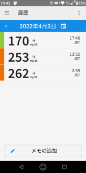 | 2022-04-3 | 血糖値 | 食事 | 即効性インスリン 注射量 | 持続性インスリン 注射量 |