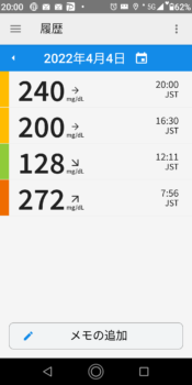 | 2022-04-4 | 血糖値 | 食事 | 即効性インスリン 注射量 | 持続性インスリン 注射量 |