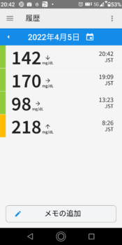 | 2022-04-5 | 血糖値 | 食事 | 即効性インスリン 注射量 | 持続性インスリン 注射量 |