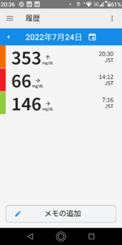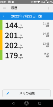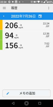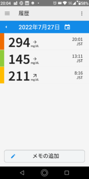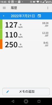 | 2022-07-22 | 血糖値 | 食事 | 超即効性インスリン 注射量 | 持続性インスリン 注射量 |