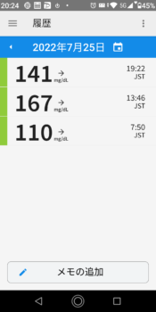 | 2022-07-24 | 血糖値 | 食事 | 超即効性インスリン 注射量 | 持続性インスリン 注射量 |