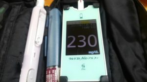 ・夕食前血糖値は高く、230mg/dlでした。昼食は600キロカロリーでと思いますが、3時頃に砂糖入りのコーヒーを飲んだからです。