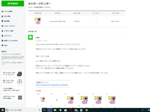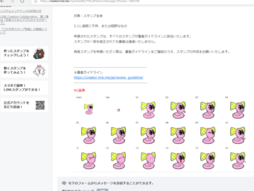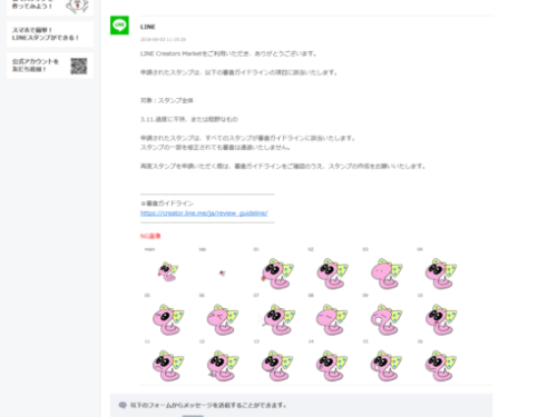 普通は画像が荒かったり、編集ミスの指摘なのです。残念なことに私の申請したスタンプはそうではなく、すべてのスタンプがダメだとメールで指摘されました。