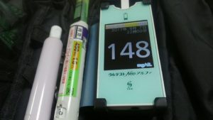 ・夕食前に低血糖になり、缶コーヒーを1本飲みました。夕食前血糖値も低血糖手前だったのでインスリン注射は後回しにして、食事しました。