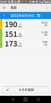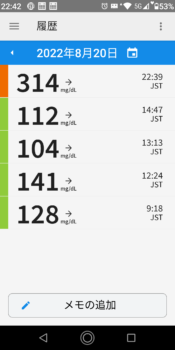 | 2022-08-22 | 血糖値 | 食事 | 超即効性インスリン 注射量 | 持続性インスリン 注射量 |