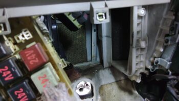 修理業者からの連絡もないので、自分で直すことにしました。トラックの室内にエバポレーターという室内機が備わっているのですが、そこにこのエアコンの故障箇所であるエキスパンションバルブがついています。