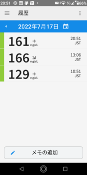 ・昼食時血糖値は少し高く、166mg/dlでした。