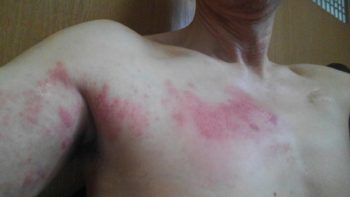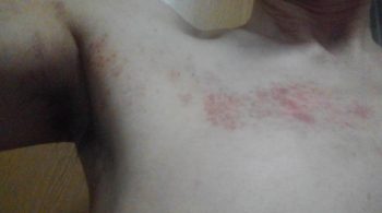 3週間目で、痛みとかゆみだけになったということです。水泡はかさぶたになり、水泡後もきれいになってきました。胸から腕の水泡後のしびれは、残ったままです。