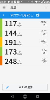 | 2022-03-27 | 血糖値 | 食事 | 即効性インスリン 注射量 | 持続性インスリン 注射量 |