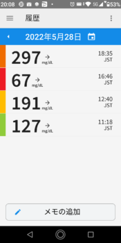 | 2022-05-28 | 血糖値 | 食事 | 即効性インスリン 注射量 | 持続性インスリン 注射量 |