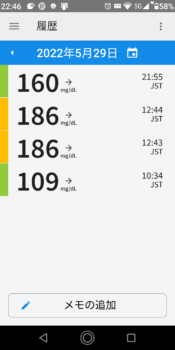 ・夕食前血糖値は少し高く、160mg/dlでした。