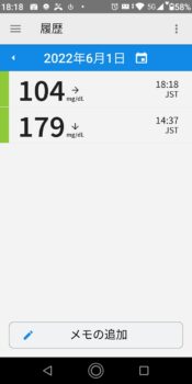 | 2022-06-01 | 血糖値 | 食事 | 即効性インスリン 注射量 | 持続性インスリン 注射量 |