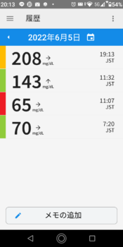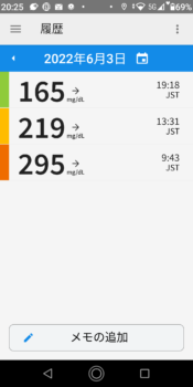| 2022-06-03 | 血糖値 | 食事 | 即効性インスリン 注射量 | 持続性インスリン 注射量 |