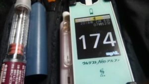 ・朝食前血糖値は高く、174mg/dlでした。昨夕食のカロリーが、かなり高かったようです。