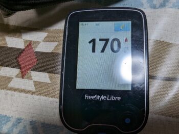 ・昼食時血糖値は少し高く、175mg/dlでした(午前11時頃に低血糖になり、缶ジュースを1本飲みました)。