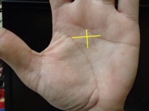 他の部位にある十字線は、神秘十字線とは異なります。多くの場合、縦線は運命線(始点に関係なく中指のつけ根の領域に向かって伸びる線)が担い、そこに短い横線がクロスしているものとなります。