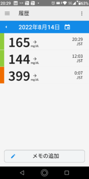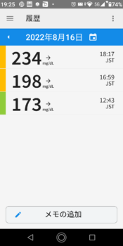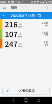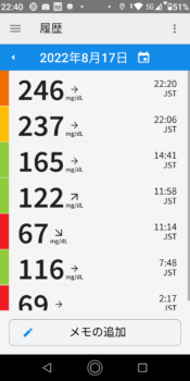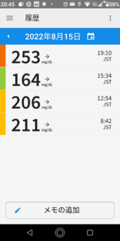 | 2022-08-15 | 血糖値 | 食事 | 超即効性インスリン 注射量 | 持続性インスリン 注射量 |