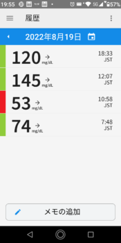 | 2022-08-19 | 血糖値 | 食事 | 超即効性インスリン 注射量 | 持続性インスリン 注射量 |