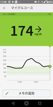 ・昼食前血糖値は少し高く、174mg/dlでした。