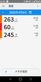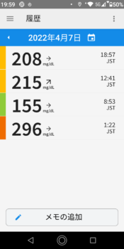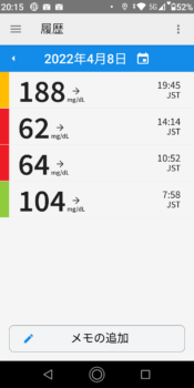 | 2022-04-7 | 血糖値 | 食事 | 即効性インスリン 注射量 | 持続性インスリン 注射量 |
