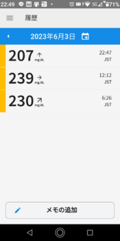 | 2023-06-03 | 血糖値 | 食事 | 超即効性インスリン 注射量 | 持続性インスリン 注射量 |