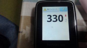 ・.夕朝食前血糖値は高く、330mg/dlでした。(昼食前が、低血糖なので、お餅をたくさん食べてしまいました。)