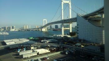 夜に長男と合流でしたが、それまで時間があるのでお台場へ観光に行きました。京浜東北線「大森」駅から「品川」駅の次の「新橋」駅で下車し、ゆりかもめに乗ってレインボーブリッジを渡り「お台場」に着きました。